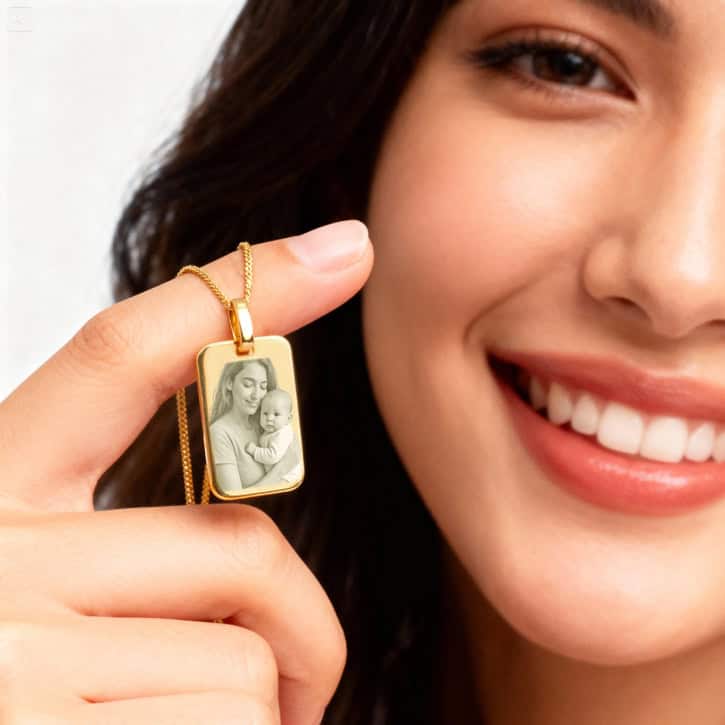 Collier pendentif gravure personnalisée avec un message, une photo à graver. La chaîne en plaqué Or est livrée également avec emballage cadeau directement avec votre commande. Ce bijou personnalisé restera unique et personnel grâce au choix de la photo que vous souhaiterez faire graver. Ce pendentif en plaqué or 18 K est disponible avec une gravure personnalisée avec un message ou une photo de votre choix. Qui peut être un message, une date. Votre bijou sera distinctif et intime en raison de l’image que vous avez sélectionnée pour la gravure.