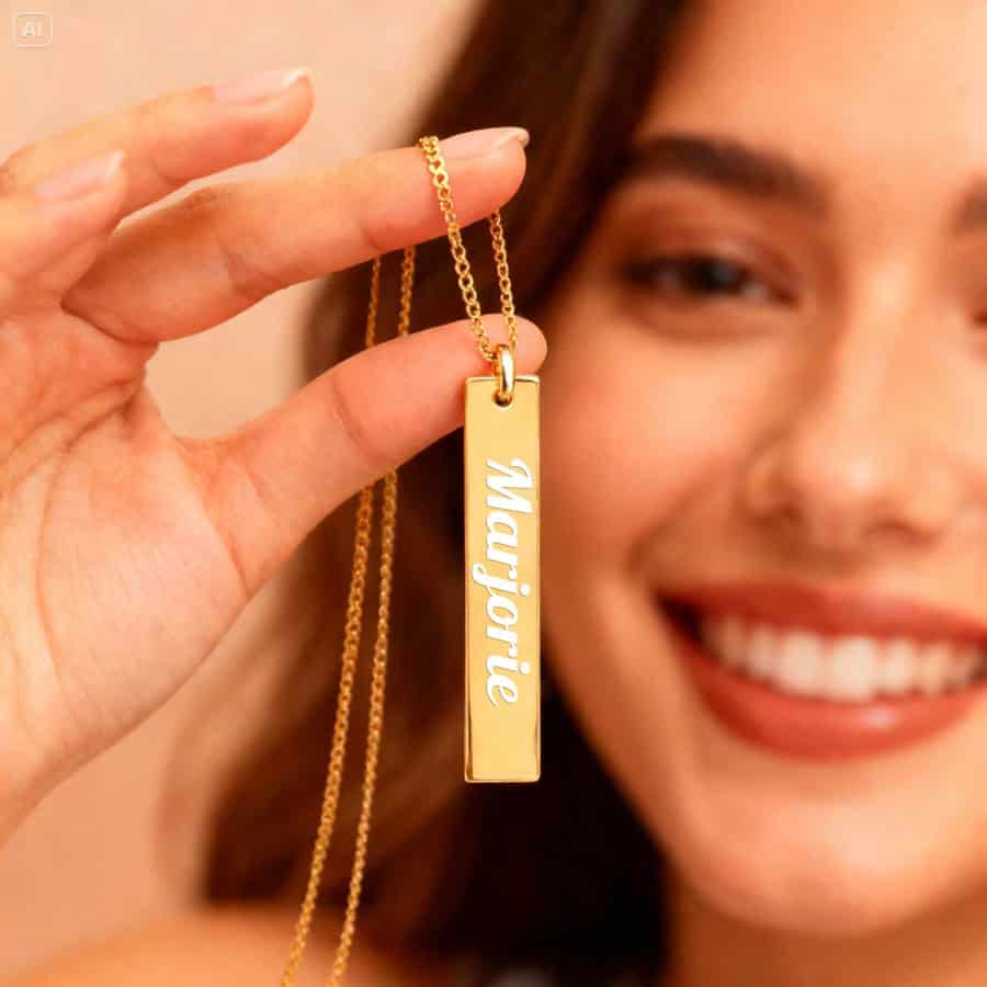 Pendentif collier barre verticale gravée et personnalisée avec un prénom, une date ou simplement un petit mot d’amour ou d’amitié. Un collier à la fois simple, moderne, intime et personnel pour vous ou un être cher. Personnalisez les deux faces de ce pendentif barre rectangle plaqué Or avec un prénom, une date, une citation ou un petit mot, qui comptent le plus pour vous, vos sources d’inspiration et vos souvenirs tout près de votre cœur.